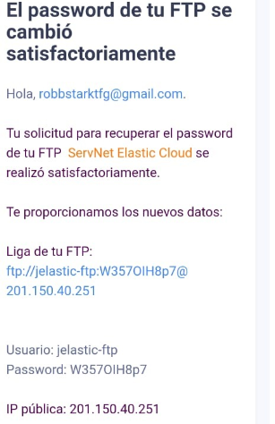 De igual manera dentro de la imagen si analizamos con detenimiento podemos visualizar dentro del apartado Nombre de usuario: jelastic-ftp.